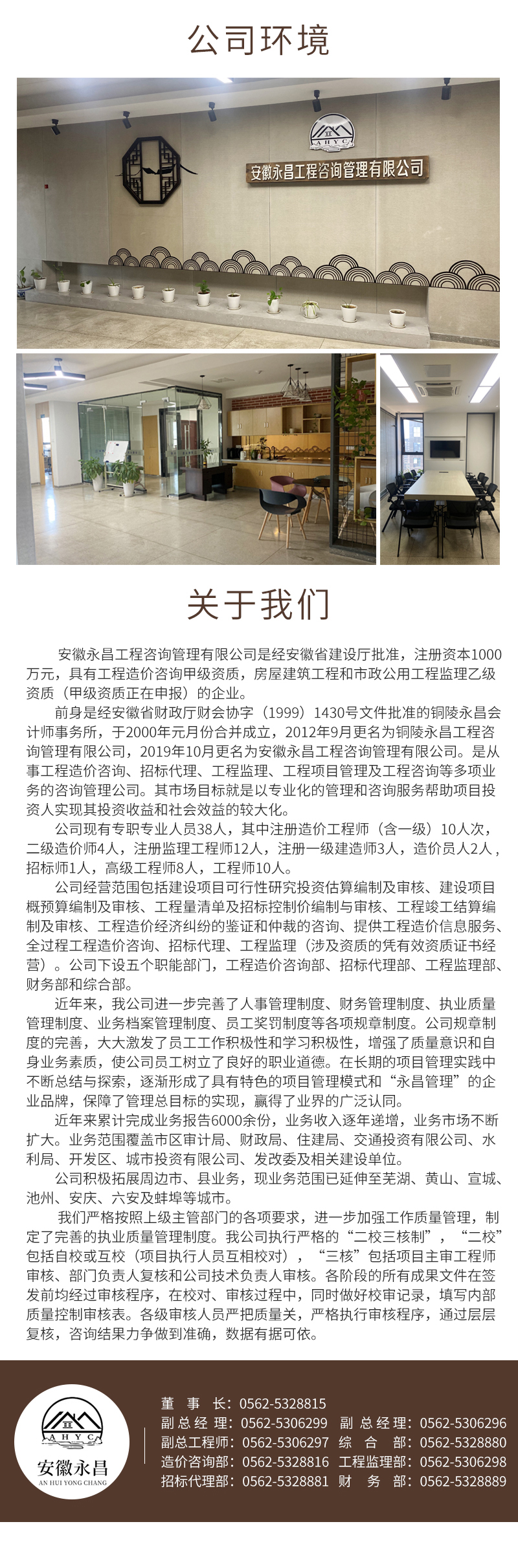安徽永昌工程咨詢管理有限公司是經(jīng)安徽省建設(shè)廳批準(zhǔn),具有工程造價咨詢甲級資質(zhì),房屋建筑工程和市政公用工程監(jiān)理乙級資質(zhì)的企業(yè)。